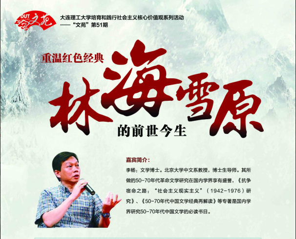 為了讓廣大師生重溫紅色經典著作《林海雪原》,校黨委宣傳部大學文化建設辦公室特舉辦大連理工大學培育和踐行社會主義核心價值觀系列活動“文苑”第51期,邀請北京大學中文系教授李楊老師為我們解讀紅色經典著作《林海雪原》。歡迎廣大師生踴躍參與!